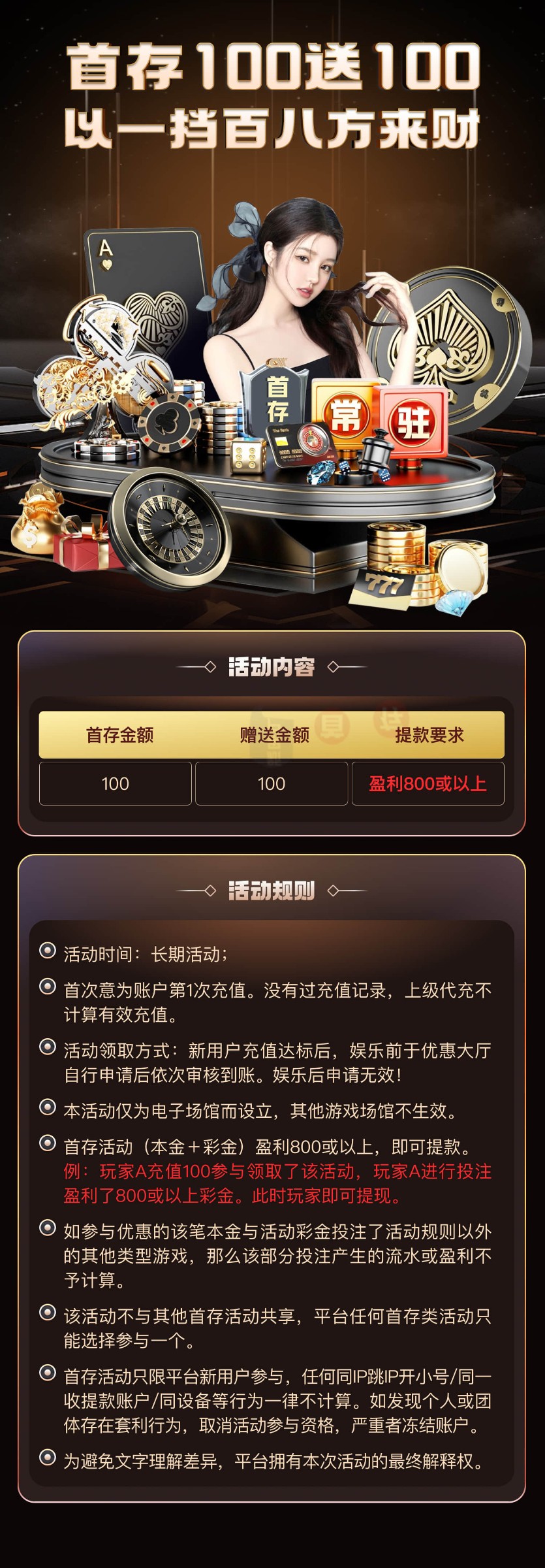 100+100(只能娱乐电子游戏,井且最低盈利588方可提现)首存活动只能参加一个参加100+100其他首存活动都无法参与,本活动仅限独立账户参与,如同一姓名、同一手机号同一IP.同一银行卡账户多账户均不参与,该活动需要在未下注申请